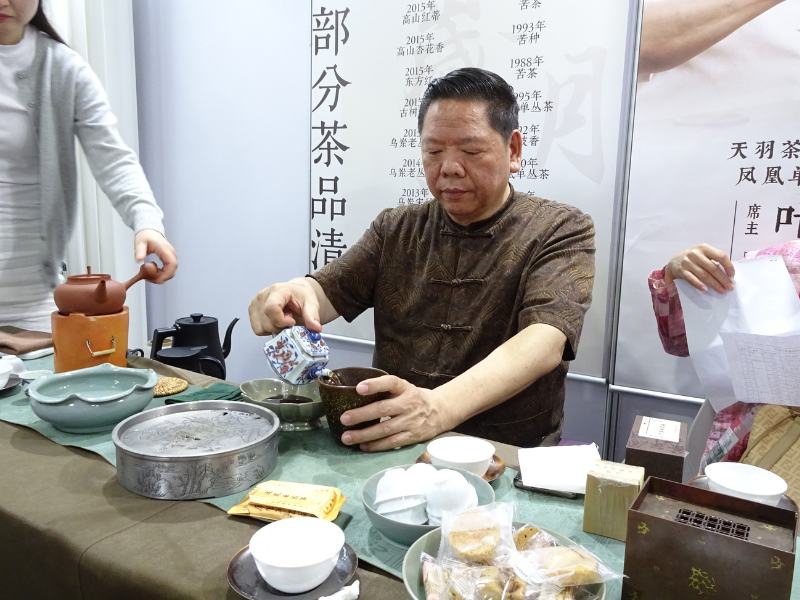 A few days later, at the Guangzhou Tea Expo, I sit at the tea table of Ye Hanzhong (叶汉钟), an Inheritor of Chaozhou Gongfu Tea Art. This Chinese title recognizes cultural ambassadors and mentors who pass on intangible practices – in this case, the Chaozhou brewing method. Ye’s business, Tianyu Tea Store (天羽茶倉), sells in-season Chaozhou tea, but his specialty is aged oolongs. Once upon a time, when a state-owned tea facility shut down, his family bought some leftover stock. Today, what was a standard Dan Cong from 1982 retails for a few hundred Renminbi for a five-gram packet.