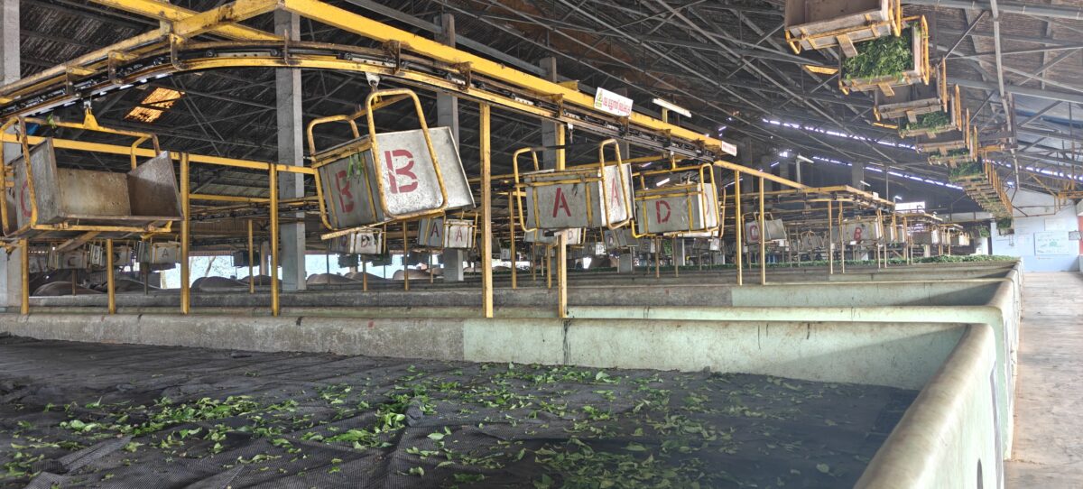 The factory in Achoor has some great automation in place. I was especially fascinated by the baskets used to load up the withered leaves and take them further ahead in the manufacturing line to the next machine. The lines were labelled B, C, and D (the A line was shut), and so were the baskets. These overhead baskets would get loaded with the tea leaves and carried to the machine.