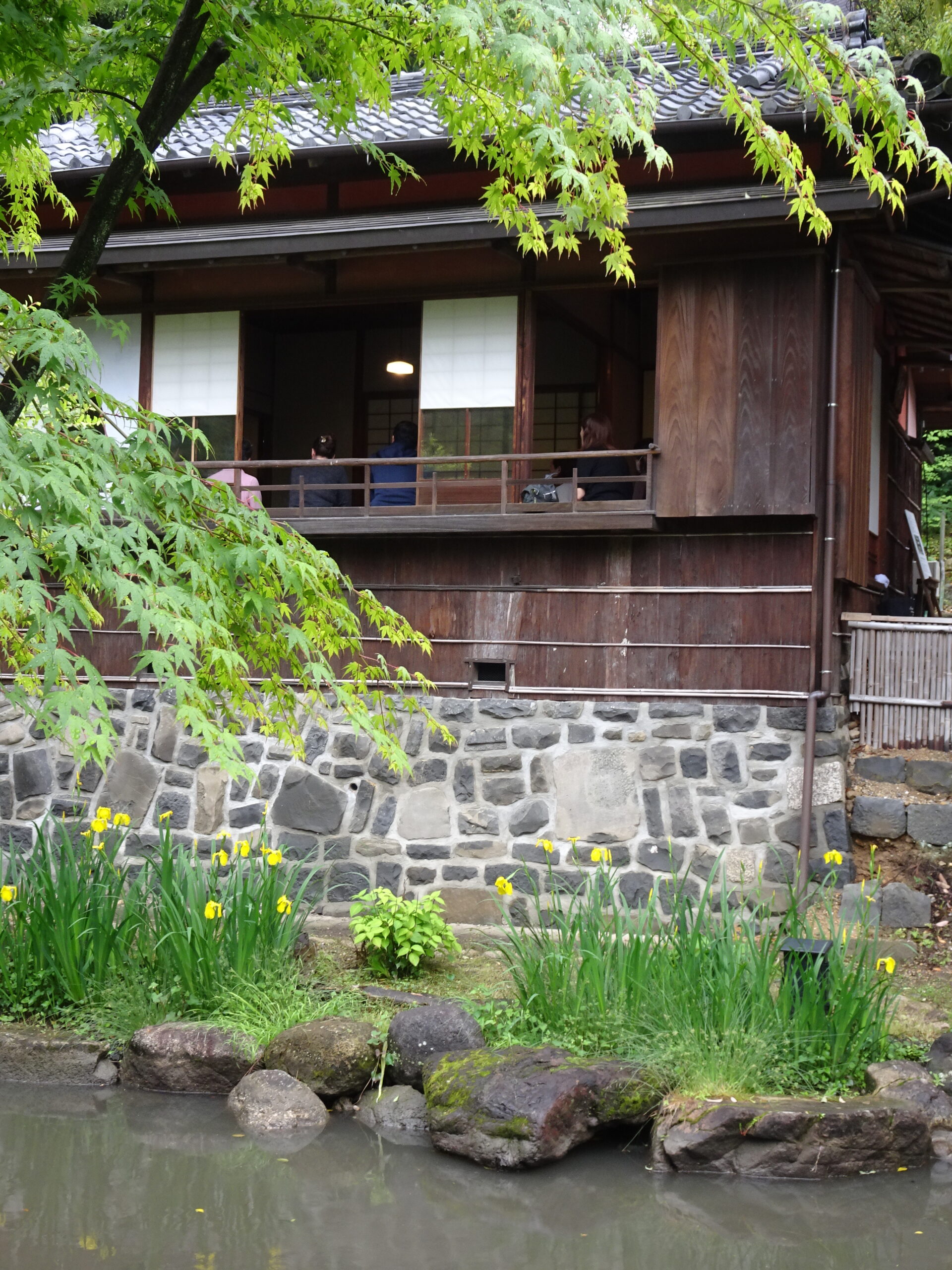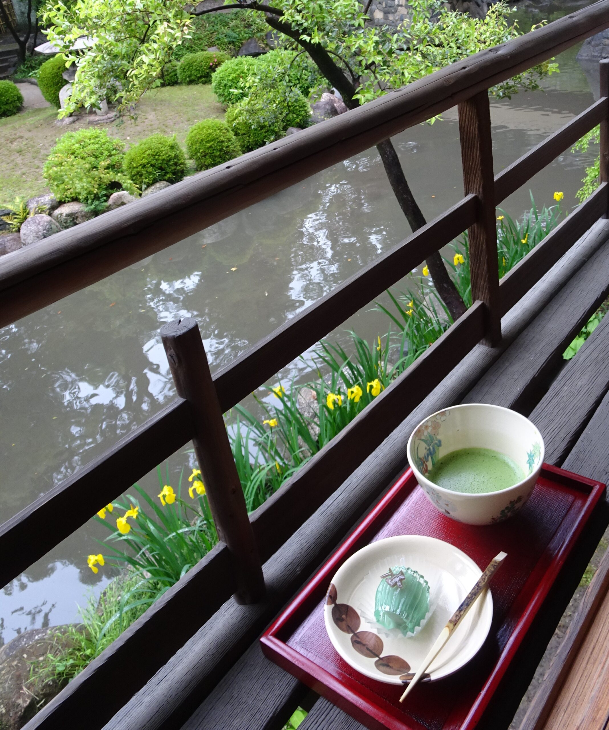 Before I drank, I rotated the bowl clockwise about 90 degrees while admiring the workmanship. I sipped with the front facing outward. Vegetal sweetness mixed with umami filled my mouth. My eyes feasted on the beauty of the ancient tea house and yellow calamus flowers. The sky reflected in the pond. After draining my tea bowl, I rotated it back again and gently placed it in front of me.