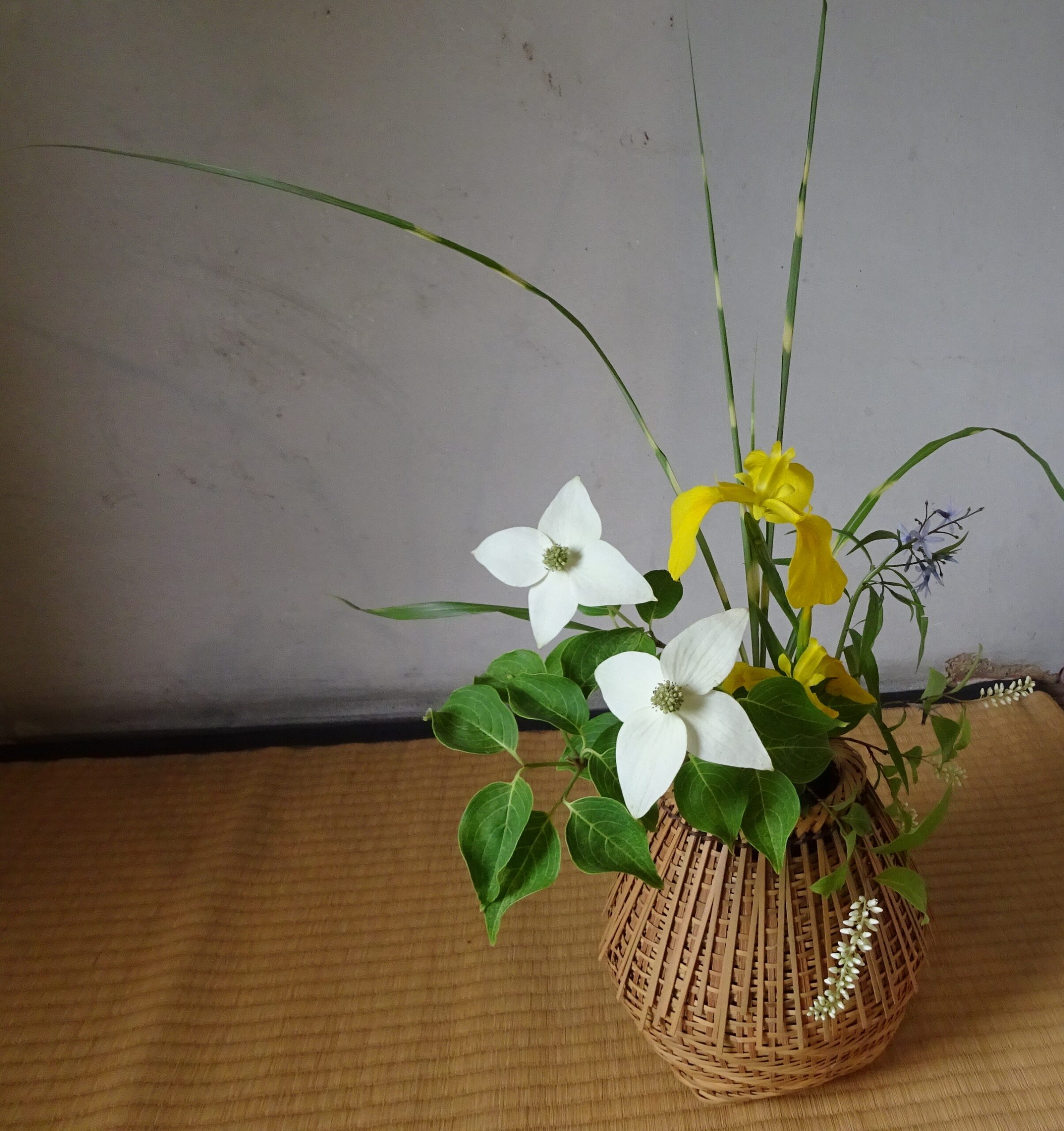 Many hosts also purchase or pick flowers and arrange them under or near the scroll to effect a particular atmosphere in the tea house. Our host said she mixed white, yellow, and purple flowers to “produce a new beauty” for us.